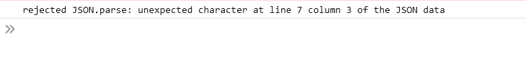 In case there is a problem with the syntax of the json file (let’s say we forgot to put a double quote around a key), then the promise returned by response.json would be rejected and also the promise of the overall async function would be. That means we could catch the error. In the example below, we access the error property on the err object:
